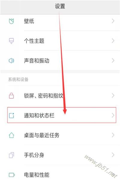 2、在设置界面下拉找到并打开【通知和状态栏】选项。