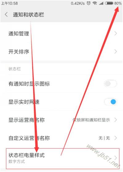 3、然后找到并点击【状态栏电量样式】,选择【数字方式】之后,我们就会发现此时的电池电量以百分比的形式显示了。