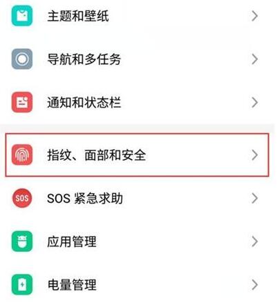 2.进入设置选项之后,找到【指纹、面部和安全】,点击打开该选项。