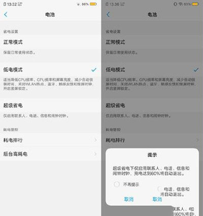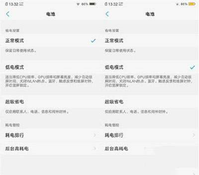 【正常模式】即日常手机的使用状态,而开启【低电模式】后,手机将自动降低 CPU、GPU频率以及屏幕亮度来减少耗电,同时会关闭 WLAN、蓝牙、GPS、减小自动锁屏时间进一步降低功耗。