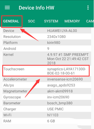 4、启动后点击常规,touchscreen就是触摸屏,BOE代表京东方,这个屏幕是没有绿屏的,如果不是这个屏幕那继续检查,如下图所示
