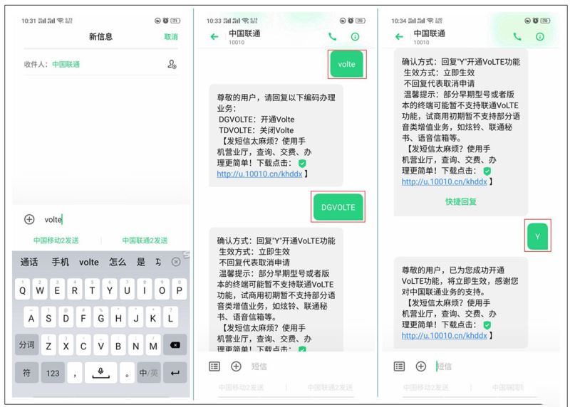 2、向运营商申请开通VoLTE高清通话功能。以中国联通为例:在手机端编辑短信“VOLTE”发送到10010,然后等待回信,回信后编辑“DGVOLTE”继续发送到10010,等待回信,然后回复“Y”,看到“尊敬的用户,已为您成功开通VoLTE功能,将立即生效…..”就可以了。
