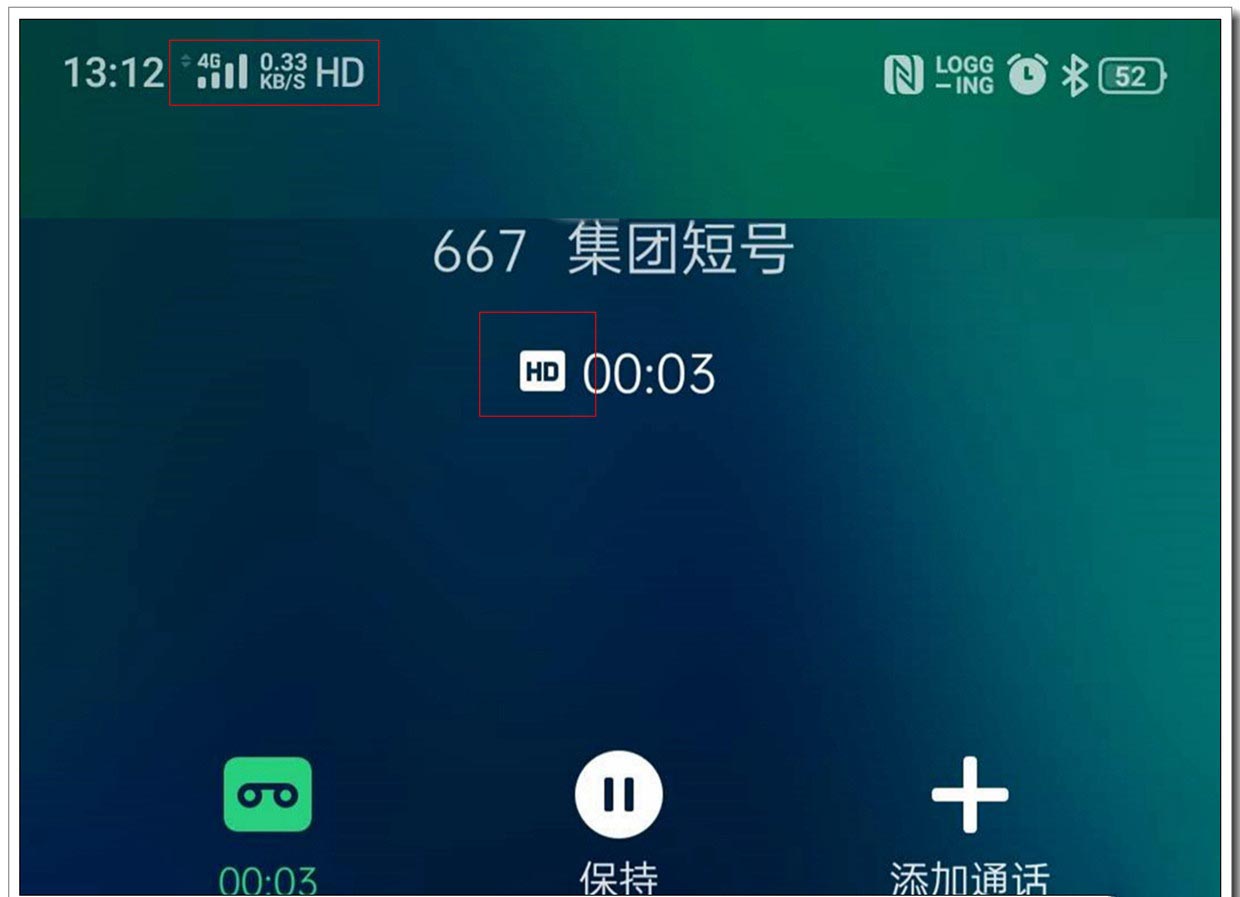 3、开通好VoLTE高清通话功能后,在通话界面我们就可以看到顶端状态栏的“HD”字样,同时在拨打电话的主界面,时长记录中也同样会有“HD”字样出现,这时表明此刻的通话是属于VoLTE高清通话的。