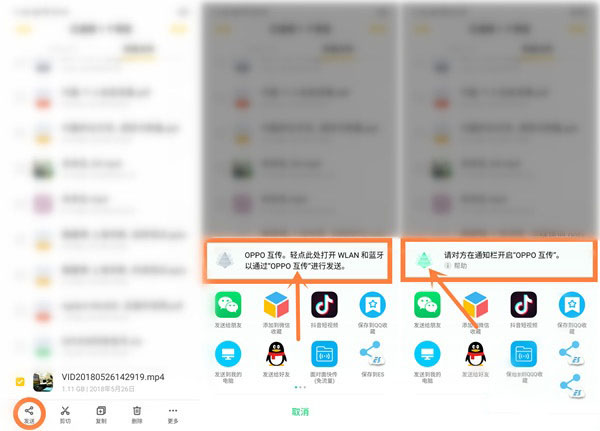 1、在发送文件的手机端,选择要发送的文件,然后点击发送。发送方式中点击最上面的 oppo 互传,oppo 互传图标呈现淡绿色说明 oppo 互传开启了。