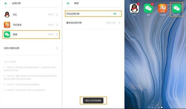 2、点击微信按钮进去,会看到有个开启应用分身选项,点击开关打开它,打开以后屏幕下方会有提示,“图标已经添加至桌面”就成功了,返回桌面查看,微信分身就已经建立好了,还可以自定义命名来区。