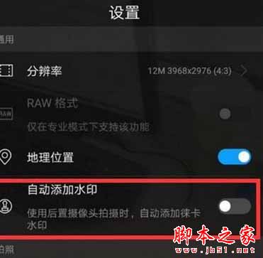 进入设置菜单后,找到并点击打开【自动添加水印】的开关即可在拍照时添加水印,关闭开关即可去掉水印。