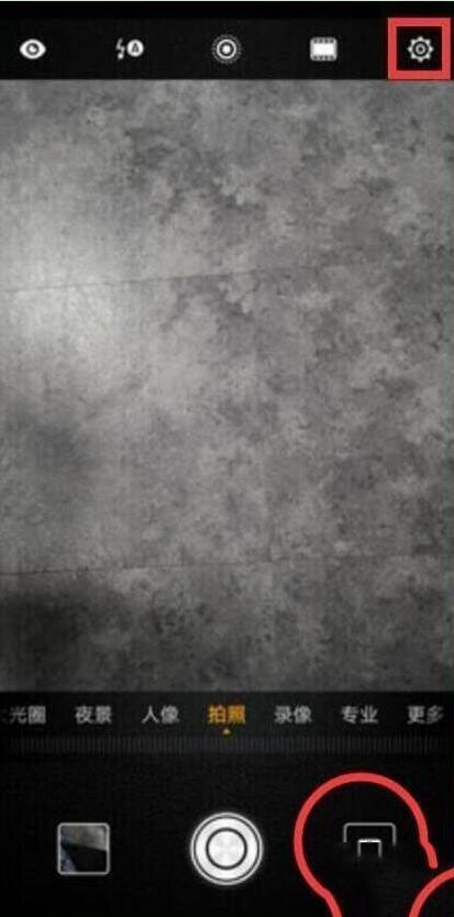 2、在相机界面点击右下角图标切换后置摄像头,点击打开右上角的【设置】,或者左滑进入设置,