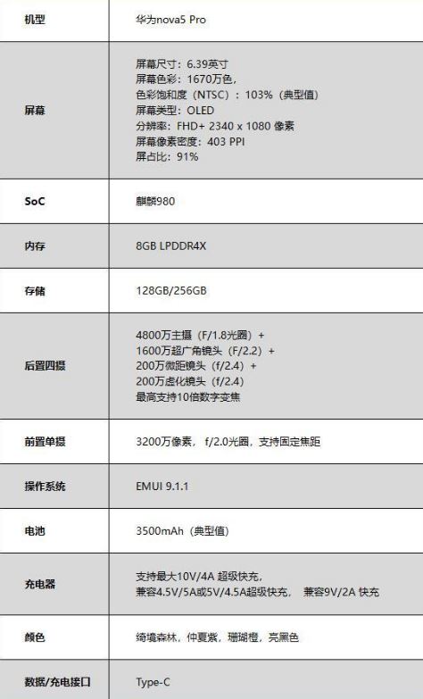 华为nova5pro参数配置及价格介绍: