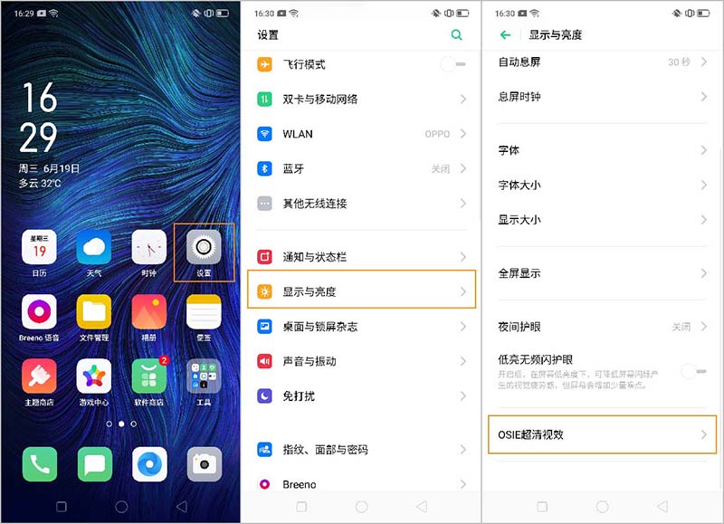 1、通过桌面【设置】—【显示与亮度】—找到【OSIE超清视效】。