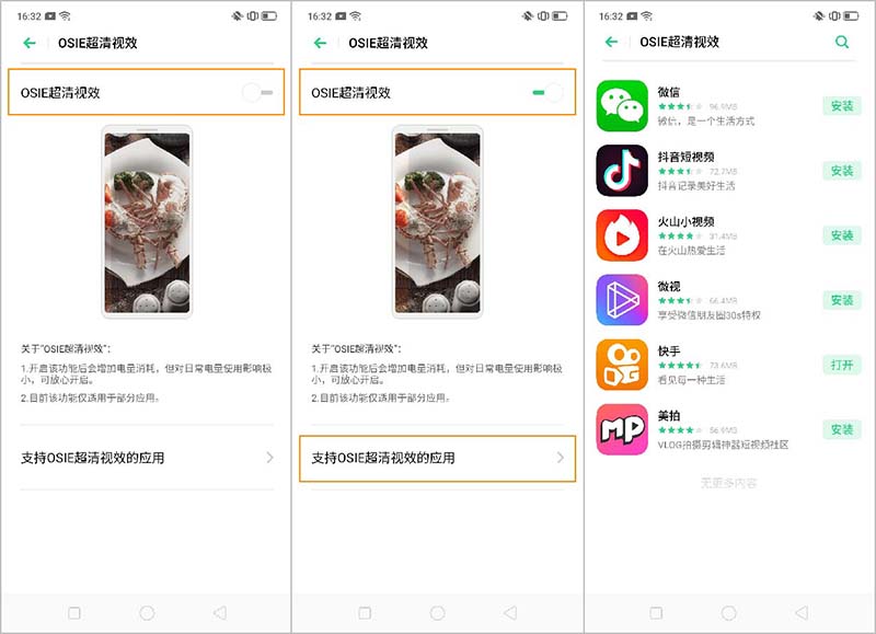 4、通过OSIE自研技术(画质增强技术),提升抖音、快手等第三方应用的画面饱和度、对比度,同时降低画面噪点,让视频更清晰,色彩更鲜艳,开启效果前和开启效果后形成的鲜明对比。可以体验一下哦~