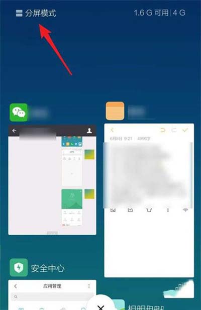1、首先从屏幕底部往上划并停顿一秒,进入多任务管理界面,然后点击左上角【分屏模式】选项。