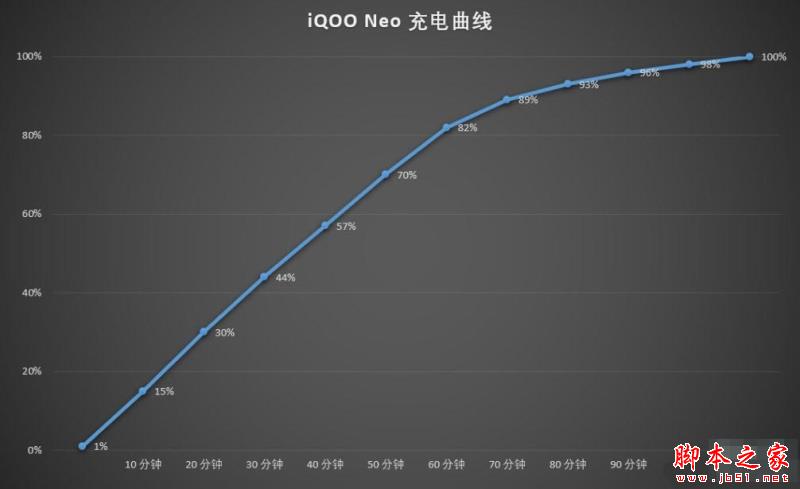 有媒体对iqooneo的充电速度进行了实测,实测结果表明,iqooneo从 1% 开始充电实测 30 分钟充至 44%,1 小时充至 82%,充满耗时 1 小时 49 分钟。主要是最后 10% 的涓流充电耗时较长。