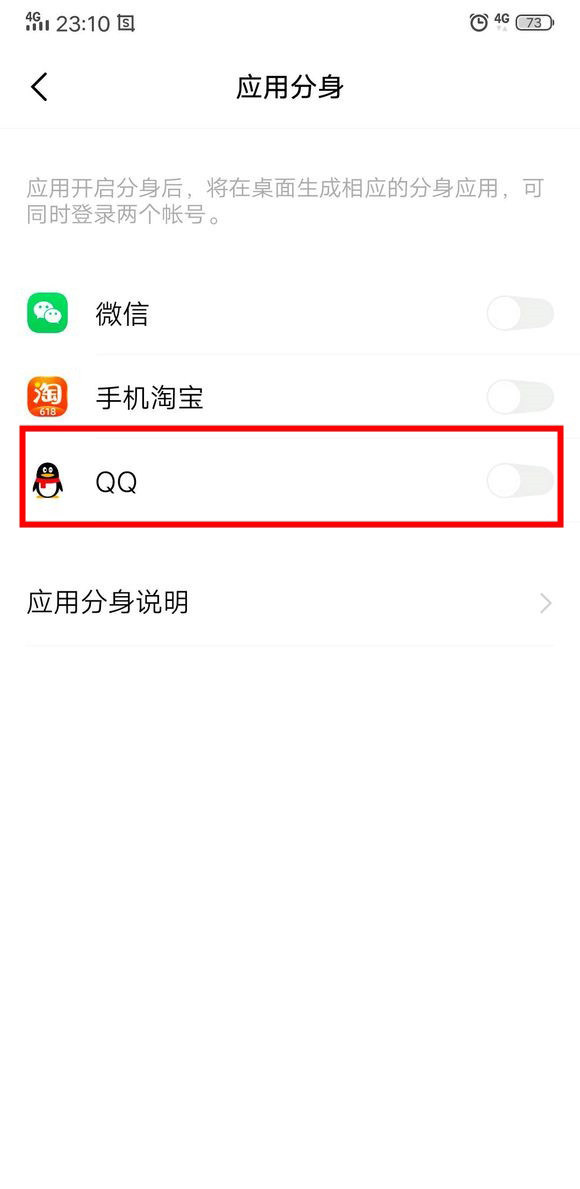 在应用分身界面,我们可以看到目前只支持微信、淘宝、QQ,我们打开需要分身的应用右边的开关按钮。