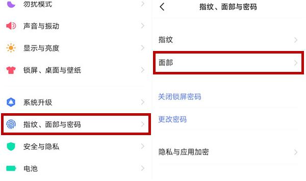 2.在设置界面下滑,找到【指纹、面部与密码】,点击进入。然后再点击【面部】。