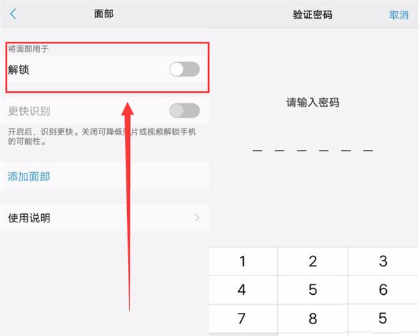 3.将面部用于【解锁】后面的开关开启,之后会让你验证手机上的解锁密码。