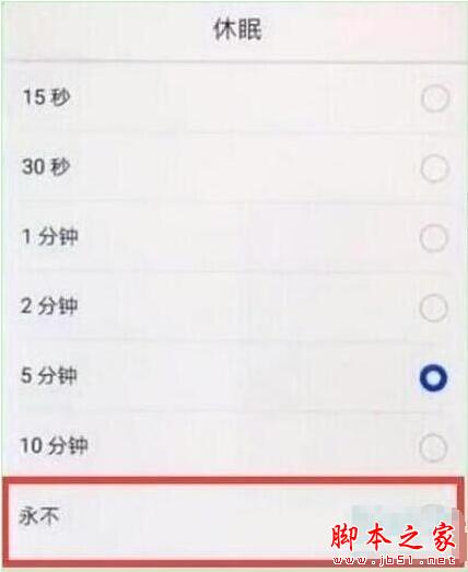 4、在弹出的选项框中点击勾选具体时间,如勾选【永不】即可设置屏幕常亮,勾选其他时间即可在规定时间熄屏。