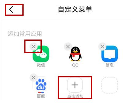 然后您可以在菜单中点击应用左上角“×”删除该应用,或者按住应用左右移动,变幻排列顺序。还可以点击“+”号添加其他应用。快捷工具菜单的操作也是如此。然后点击左上角【<】返回。