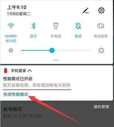 下拉状态栏,点击【关闭性能模式】也可关闭。