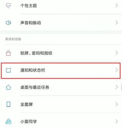 2、在设置界面下拉,找到【通知和状态栏】点击打开,