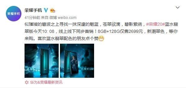 在价格上,荣耀20蓝水翡翠8GB+128GB版售价2699元,8GB+256GB版售价2999元。