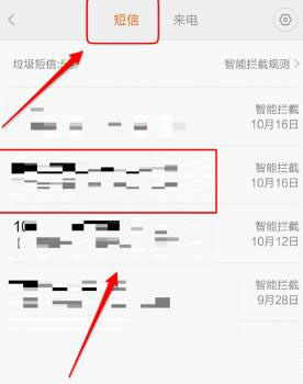 3、可以看到有短信和来电两个选项,在短信的选项下会看到被拦截的短信,随便找一个,点击进入。