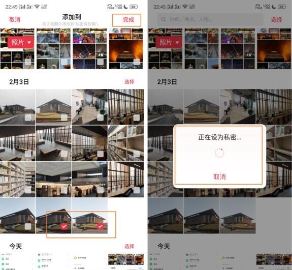 1、进入私密保险箱后,以「相册」为例,点击右上角的「+」号,选择需要加密的图片后,点击「完成」即可。