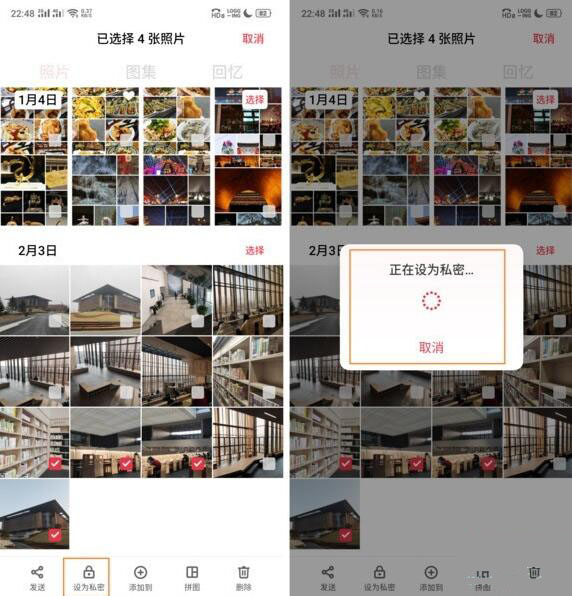 2、在桌面进入「相册」后,选择需要加密的图片后,点击「设为私密」即可。
