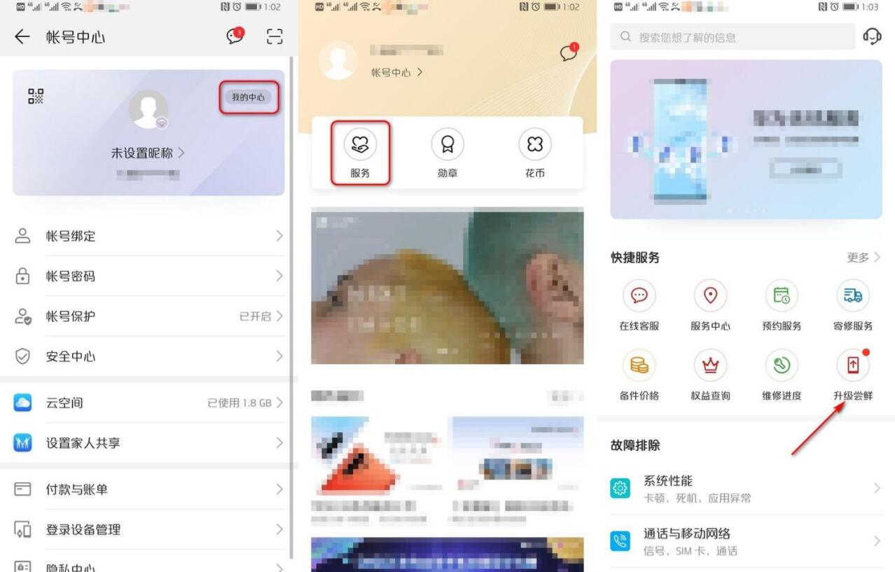 2、点击我的中心。然后点击服务选项,进入服务界面,点击升级尝鲜。