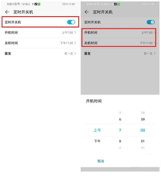 进入【定时开关机】之后,点击右边小按钮开启,根据需要设置定时关机时间以及定时开机时间,还有重复时间等等。