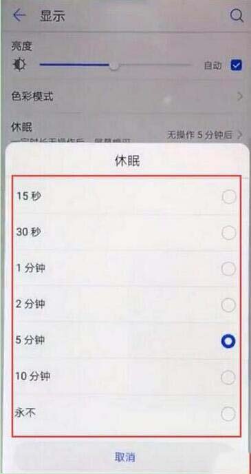 4、然后我们就可以在弹出的选项框中点击勾选合适的休眠熄屏时间,点击勾选【永不】的话,手机打开锁屏后即使无操作也会屏幕常亮。