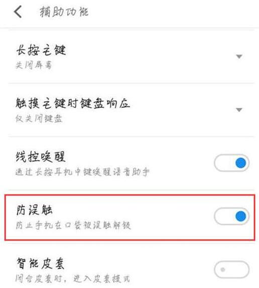 3.在辅助功能界面,我们接着操作,找到【防误触】打开该功能,当按钮已经变成蓝色状态,说明已经成功开启防误触功能了。