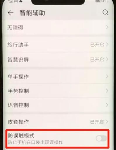 3、在智能辅助的菜单下可以找到【防误触模式】,点击打开或关闭后面的开关即可打开或关闭防误触模式。