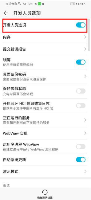 4、点击打开【开发者选项】的开关,
