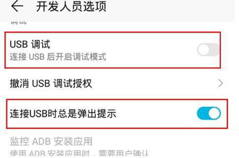 5、接下来点击打开【USB调试】的开关,还可以点击打开下面的【连接USB时总是弹出提示】的开关,这样手机插上电脑时会自动弹出提示让我们点击打开USB,就不会连接电脑没反应了,打开USB后,在通知栏把【仅充电】改成【管理文件】或者【查看照片】即可连接电脑传输文件了。
