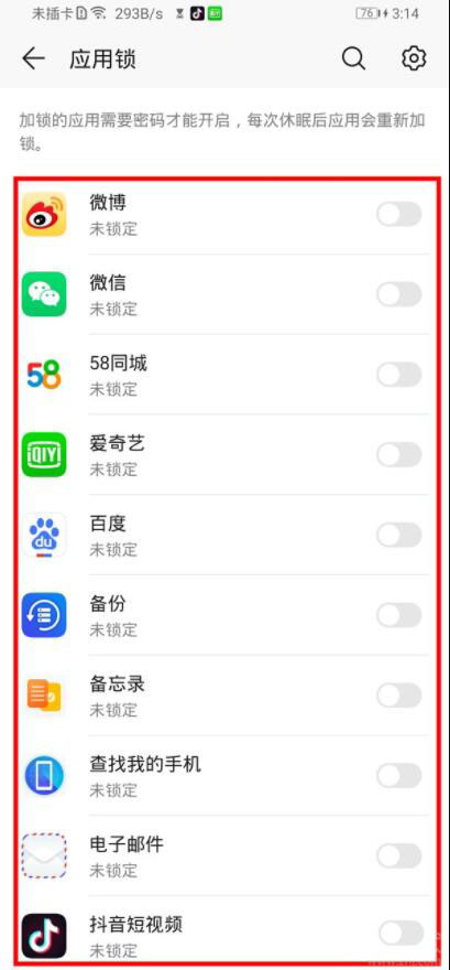 4、点击打开需要设置指纹应用锁的应用右侧的开关。