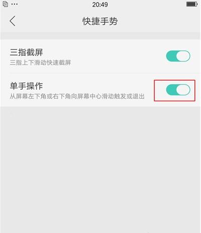 3、快捷手势界面当中,找到并开启【单手操作】按钮开关就可以了。