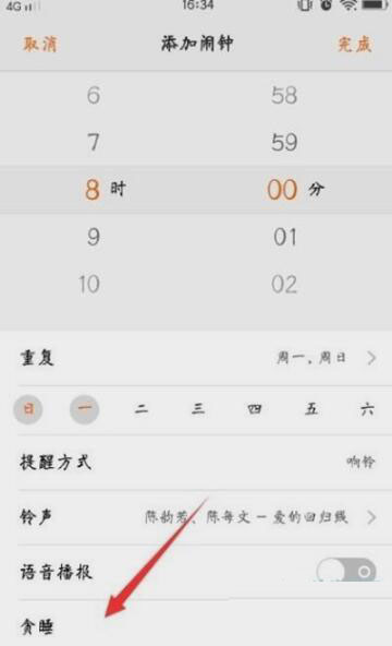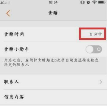 1、如果闹钟响了一次后,你没有听到,闹钟会在固定时间再次响铃,这个固定时间就要在【贪睡】里设置。