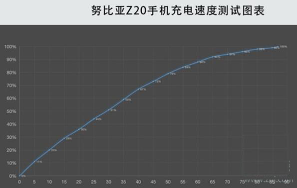 有媒体对努比亚z20的充电速度进行了实测,实测结果显示,使用努比亚Z20标配的充电器和数据线,将手机从电量为0%冲满到100%,共耗时87分钟,27W PD快充的效果果然出色。