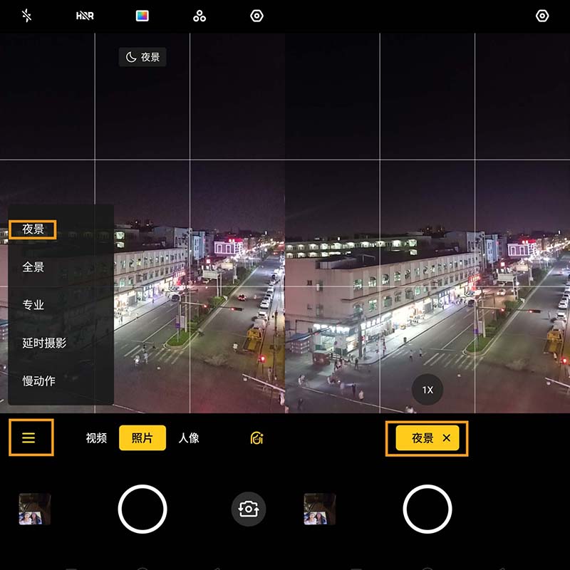 2、然后点击三横—选择夜景,这样就已调试到夜拍模式,根据周围环境、角度、光线来调试点击触屏拍照,因晚上光线不比白天光线好,拍夜景时需要几秒来聚焦才能拍出更好看的照片,所以在没有完成拍摄的情况下不建议移动手机。