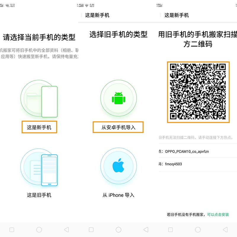 2、当前机型为A9新手机,选择当前手机类型—(以从安卓机导入为例)这是新手机—从安卓手机导入—就会出现一个二维码。