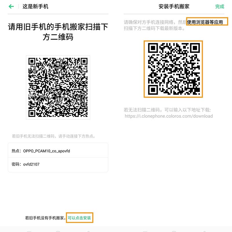 3、假如旧手机没有手机搬家点击最下面—可点击安装—出现二维码后用旧手机浏览器内的扫码功能进行扫这个二维码进行下载即可,若无法扫二维码复制下载地址在浏览器内进行下载即可。