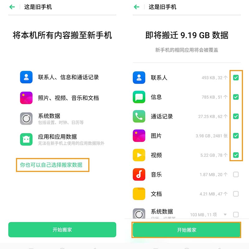 8、还可以由自己选择需要搬家数据—勾选需要传输的数据点击-开始搬家等待传输完成即可。