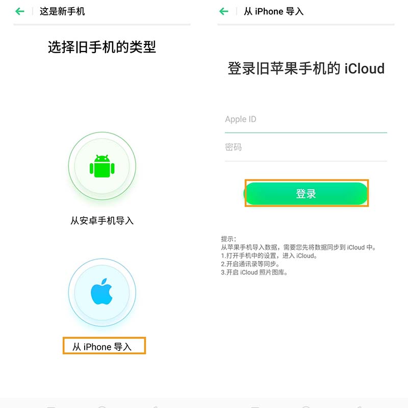 9、如果旧手机是苹果手机,从iPhone导入—登录原苹果手机的iCloud账户、Apple ID+密码。或者短信验证码、验证成功后,选择iCloud上的相册和联系人数据,恢复到新手机即可。