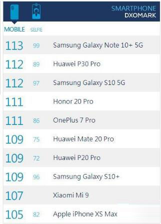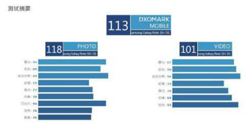三星note10+ 5G版DXO得分总分为113分。其中拍照118分,视频101分,前置摄像头则拿下了99分,目前排名第一。
