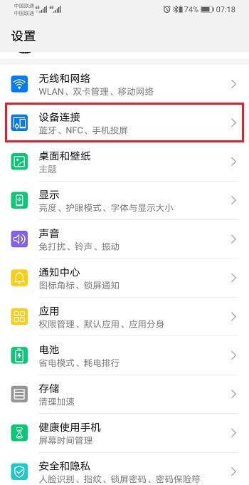 2、在华为p30设置中,点击设备连接,如下图所示: