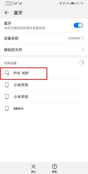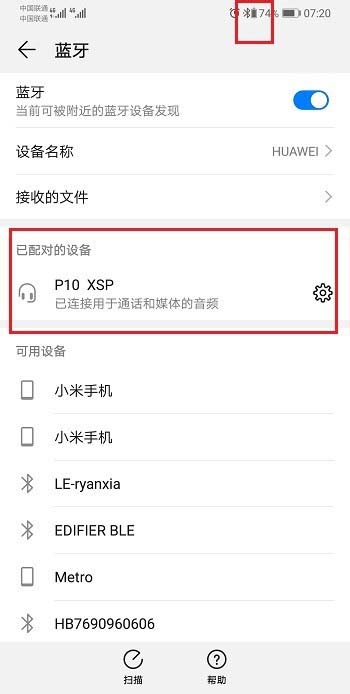 4、进去华为p30蓝牙连接界面,先开启蓝牙耳机,然后开启手机蓝牙,点击下方的扫描找到蓝牙耳机,点击搜索到的蓝牙耳机进行连接,如下图所示: