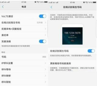方法一:打开vivox23幻彩版手机中的系统【设置】→【电话】→开启在线识别陌生号码,在收到陌生来电时,系统会自动提示识别的陌生号码,还支持更新离线号码数据库,随时随地让你免除骚扰。