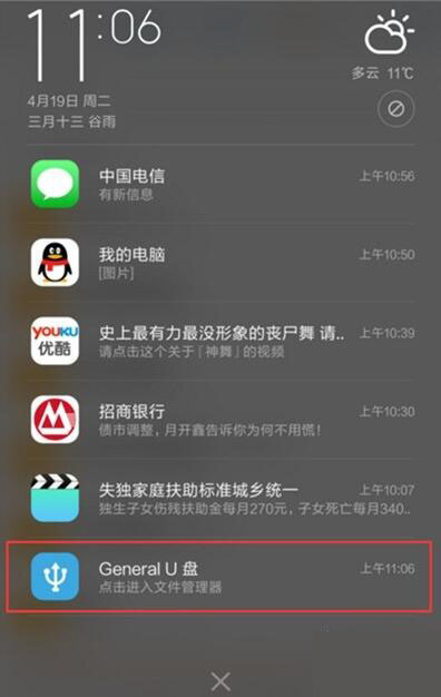 2、当手机连接otg之后,下拉手机上方通知栏会看到一个提示