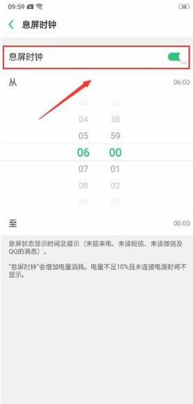 4、点击【息屏时钟】右侧的按钮开启,并设置起止时间,这样我们的息屏时钟就已经设置好了。
