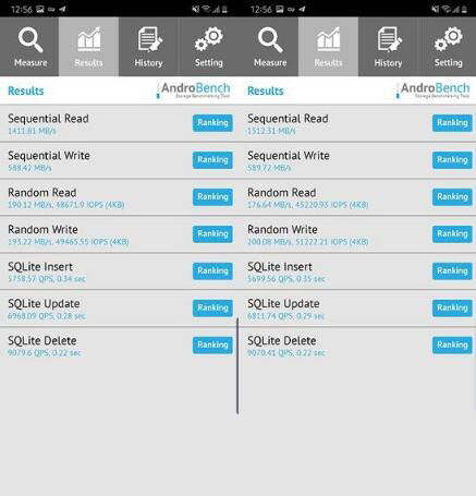 三星note10+标配了顶级闪存模式UFS 3.0。通过Androbench测试,三星note10+连续读取速度为1512.31MB/s,连续写入589.72MB/s,随机读取176.64MB/s,随机写入200.08MB/s。